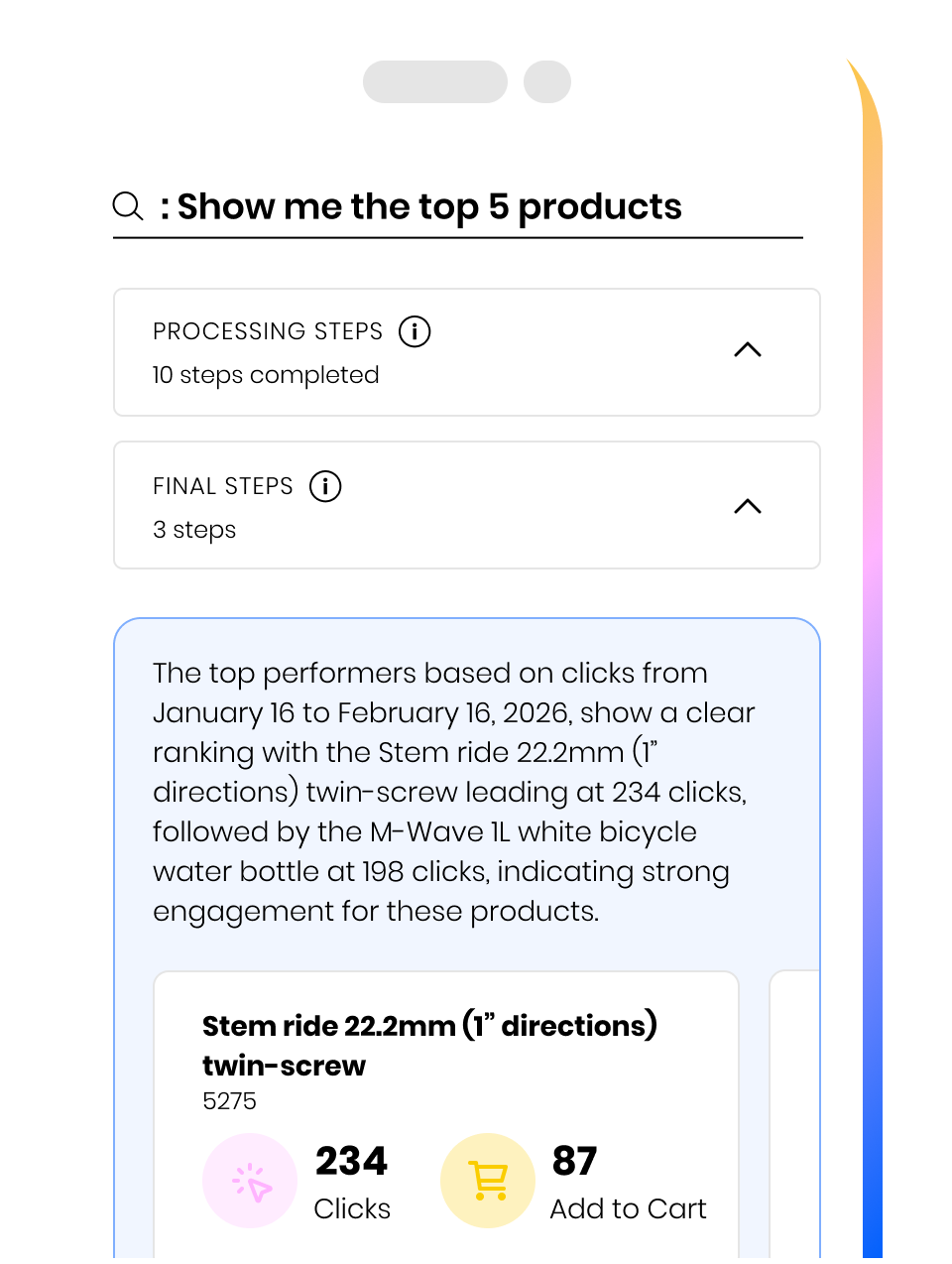 Ask what matters most to you. Get instant AI answers, product comparisons, trend insights, and tips on how to improve your shop. Chat from the search bar, apply rules as you go, and never pay for your own searches.